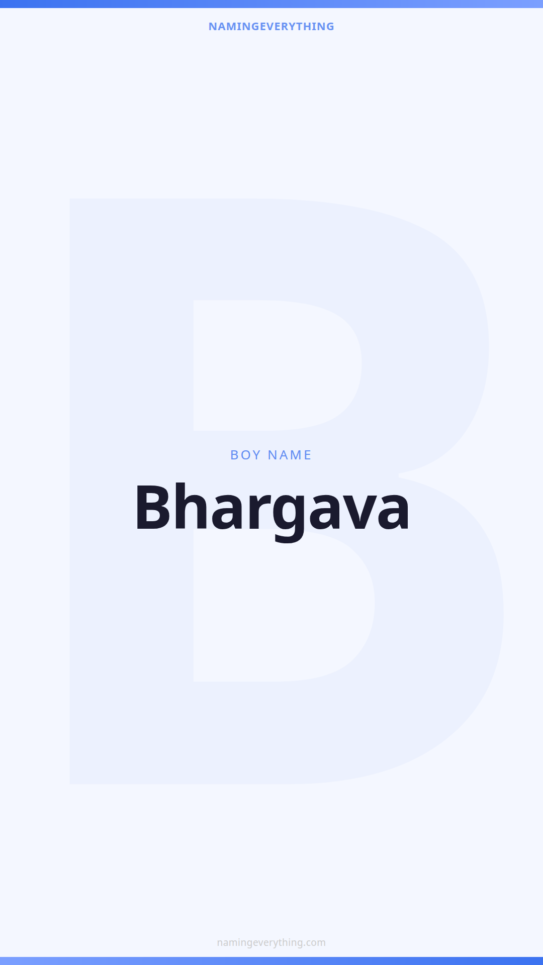 Download a shareable image with Bhargava's meaning, origin, and popularity. Ready for Instagram, Pinterest, or texting to your partner.