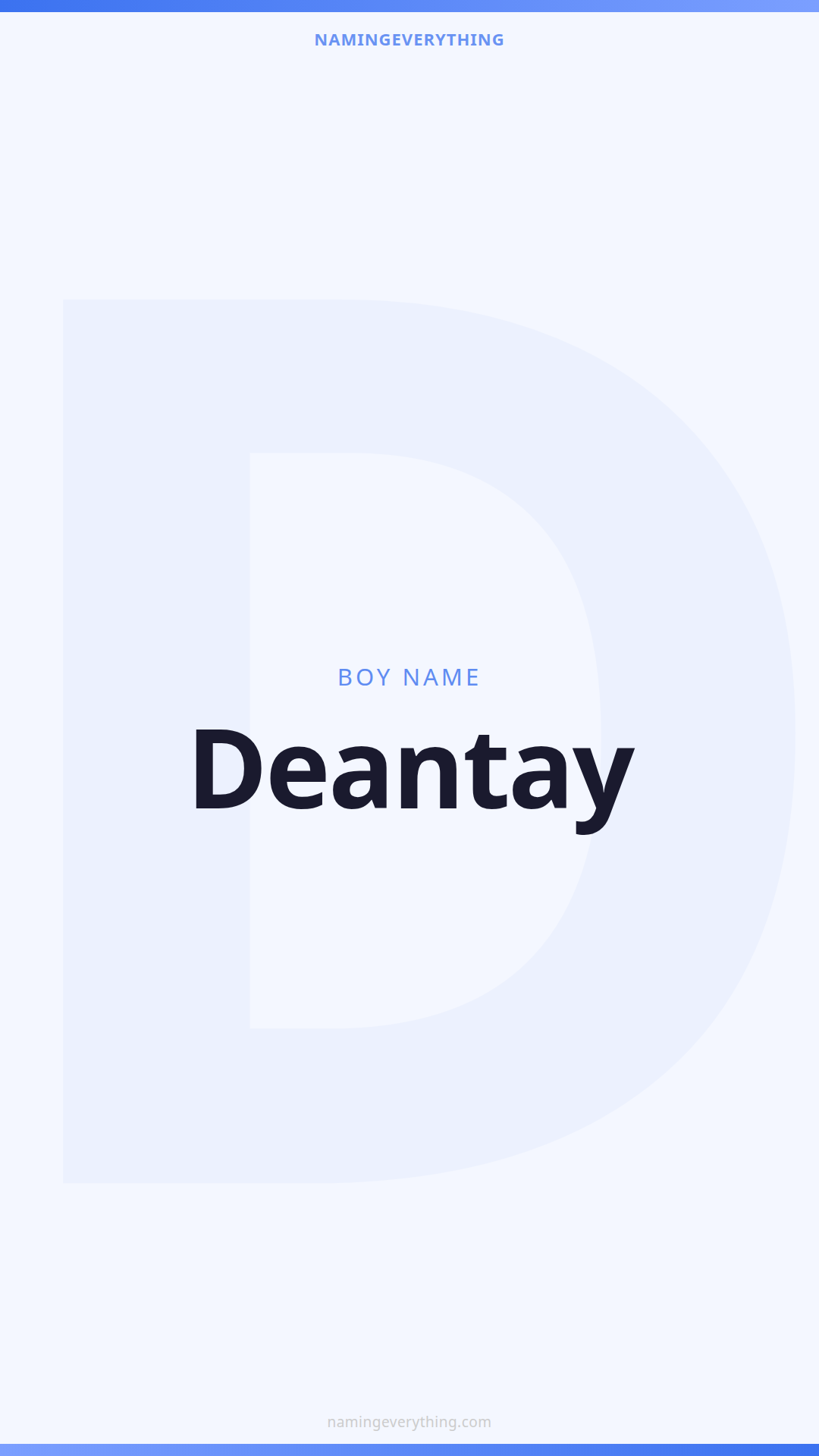 Download a shareable image with Deantay's meaning, origin, and popularity. Ready for Instagram, Pinterest, or texting to your partner.