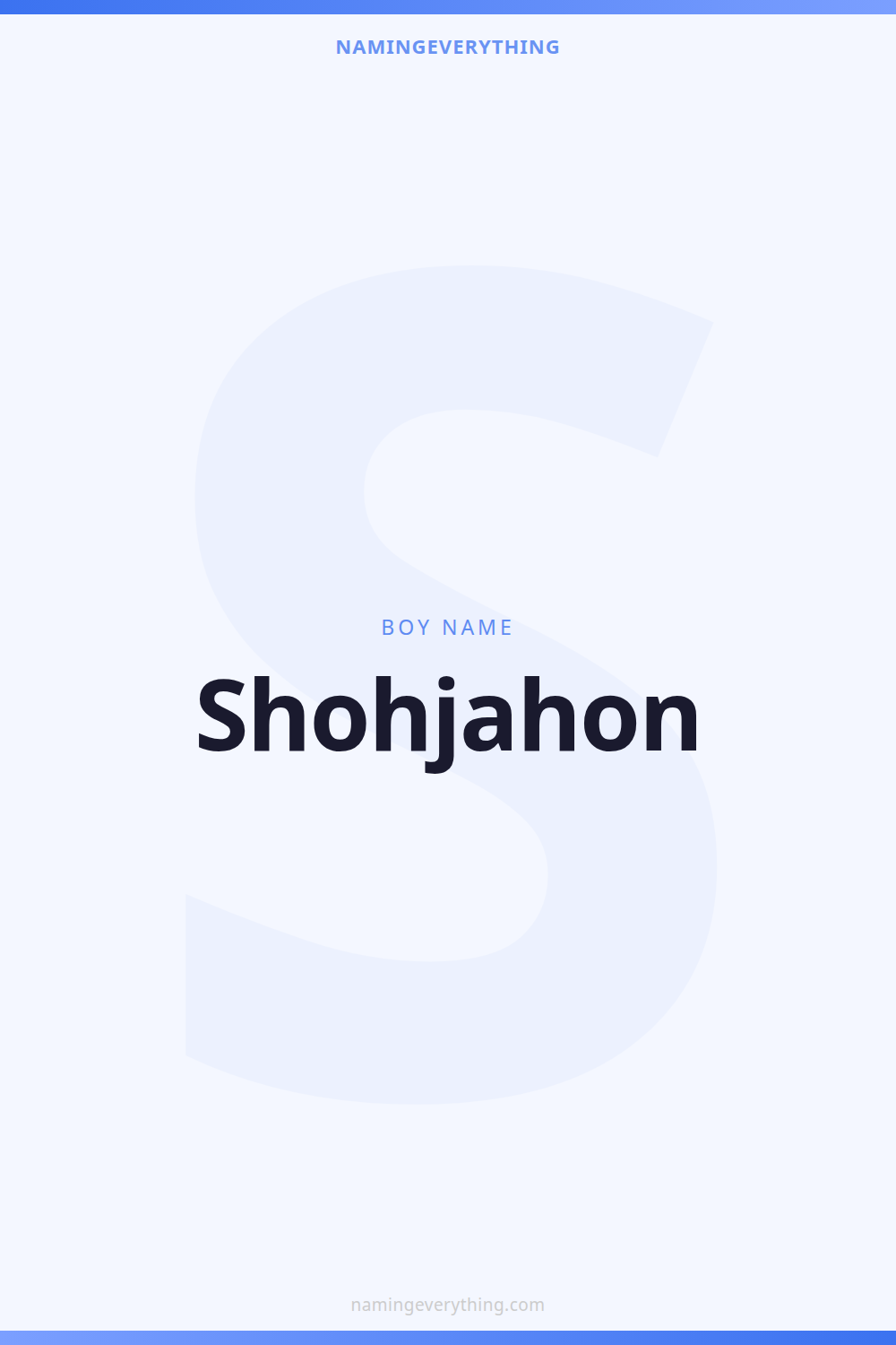 Download a shareable image with Shohjahon's meaning, origin, and popularity. Ready for Instagram, Pinterest, or texting to your partner.